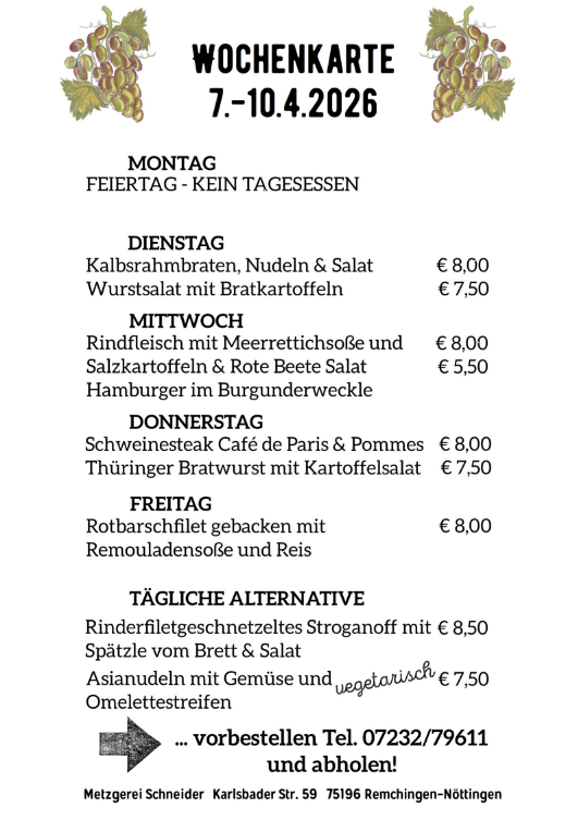 Wochenkarte 07. - 10.04.2026 Metzgerei Ralf Schneider Firmen, Produkte und Dienstleistungen - Digitale Sichtbarkeit für Karlsruhe–Pforzheim Veröffentlicht von Metzgerei Schneider in Gastro & Kulinarik · Dienstag 07 Apr 2026