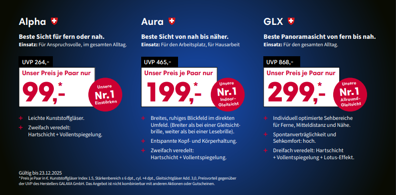 * Preis je Paar in €. Kunststoffgläser Index 1.5, Stärkenbereich ± 6 dpt., cyl. +4 dpt., Gleitsichtgläser Add. 3,0, Preisvorteil gegenüber