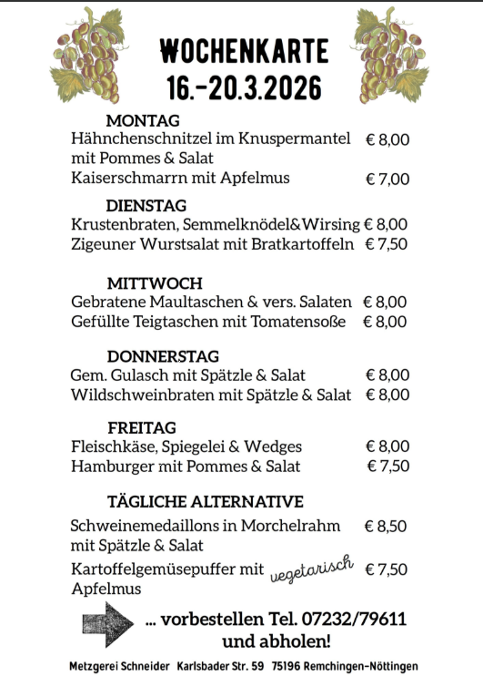 Unsere Tagesessen 16. - 20-03.2026 Metzgerei Ralf Schneider Firmen, Produkte und Dienstleistungen - Digitale Sichtbarkeit für Karlsruhe–Pforzheim Veröffentlicht von Metzgerei Schneider in Gastro & Kulinarik · Montag 16 Mär 2026
