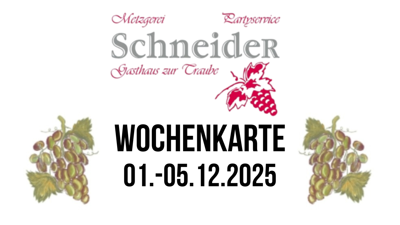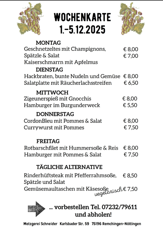 Unsere Wochenkarte vom 01.-05-12.2025 Metzgerei Ralf Schneider Firmen, Produkte und Dienstleistungen aus der Region zwischen Karlsruhe und PforzheimVeröffentlicht von Metzgerei Schneider in Gastro & Kulinarik · Montag 01 Dez 2025