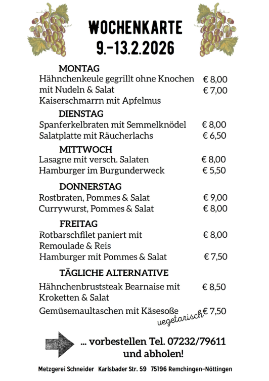 Unsere Wochenkarte vom 09.02. - 13.02.2026 Metzgerei Ralf Schneider Firmen, Produkte und Dienstleistungen - Digitale Sichtbarkeit für Karlsruhe–Pforzheim Veröffentlicht von Metzgerei Schneider in Gastro & Kulinarik · Montag 09 Feb 2026