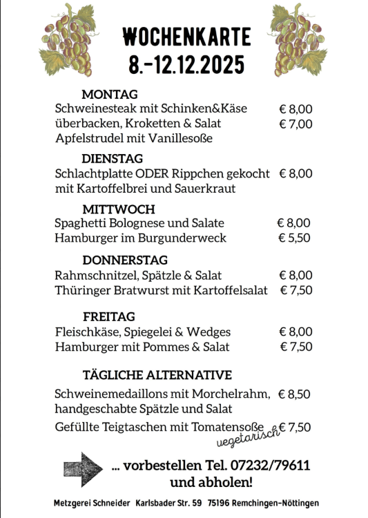 Wochenkarte 08.-12.12.2025 Metzgerei Ralf Schneider Firmen, Produkte und Dienstleistungen aus der Region zwischen Karlsruhe und PforzheimVeröffentlicht von Metzgerei Schneider in Gastro & Kulinarik · Sonntag 07 Dez 2025