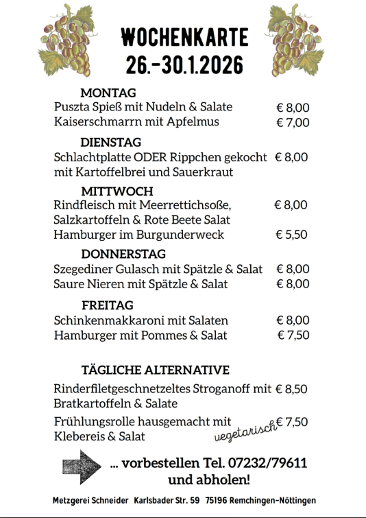 Wochenkarte 26. - 30.01.2026 Firmen, Produkte und Dienstleistungen aus der Region zwischen Karlsruhe und PforzheimVeröffentlicht von Metzgerei Schneider in Gastro & Kulinarik · Montag 26 Jan 2026